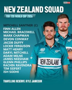 இலங்கை மற்றும் இந்தியாவில் அடுத்த மாதம் நடைபெறவுள்ள T20 உலகக் கிண்ணத்திற்கான அணியினை நியூசிலாந்து அறிவித்துள்ளது, வலுவான சுழற்பந்து வீச்சாளர்களை கொண்ட இந்த அணியினை மிட்சல் சான்ட்னர் தலைமையேற்று வழிநடாத்துகின்றார் !